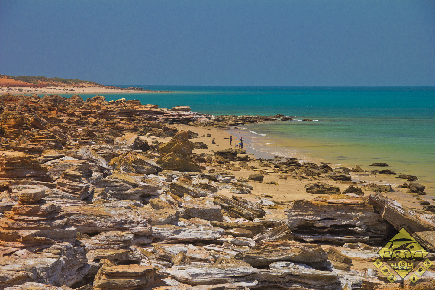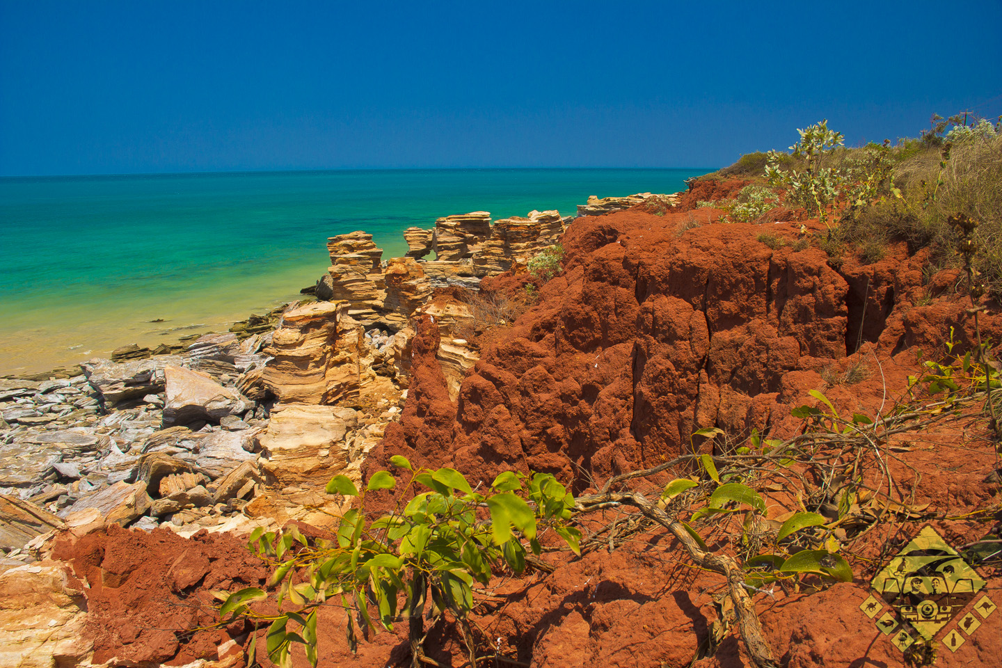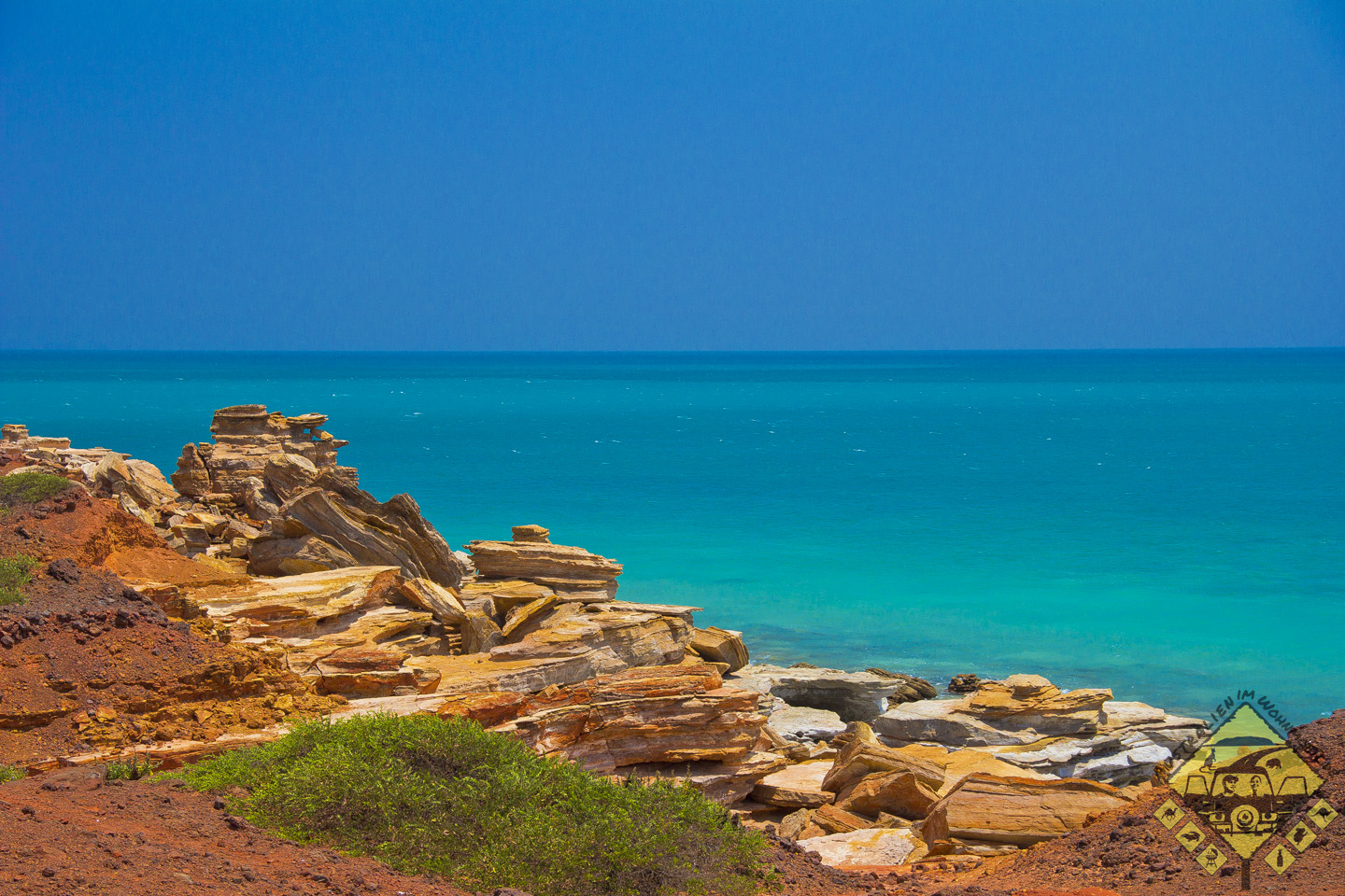 Wir haben einen Kontinent durchquert. Von einem Meer zum anderen. Von den Stränden Queenslands aus sind wir wochenlang durch schöne aber einfarbige Wüste gefahren und sind nun Experten in Rot. Wir kennen Rot. In jeder Schattierung.Manchmal waren wir sogar selbst rot, wenn Schwitzen und Wind so zusammenkamen, dass wir wie panierte Schnitzel aussahen.Wochenland. Nur Rot und Orange, nur Stein und Staub, tote Büsche und spitzes Spinifex.Und dann auf einmal biegen wir um eine Kurve und fahren fast in den Graben.Da ist Blau. Und Türkis. Und Weiß! Und ganz viel dazwischen!Endlich in Broome!