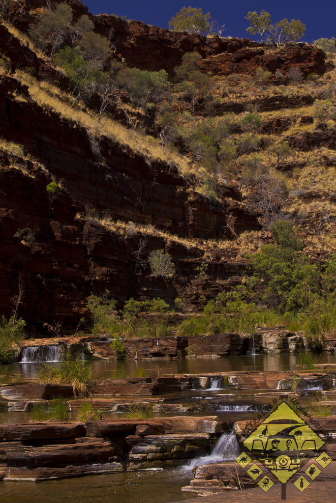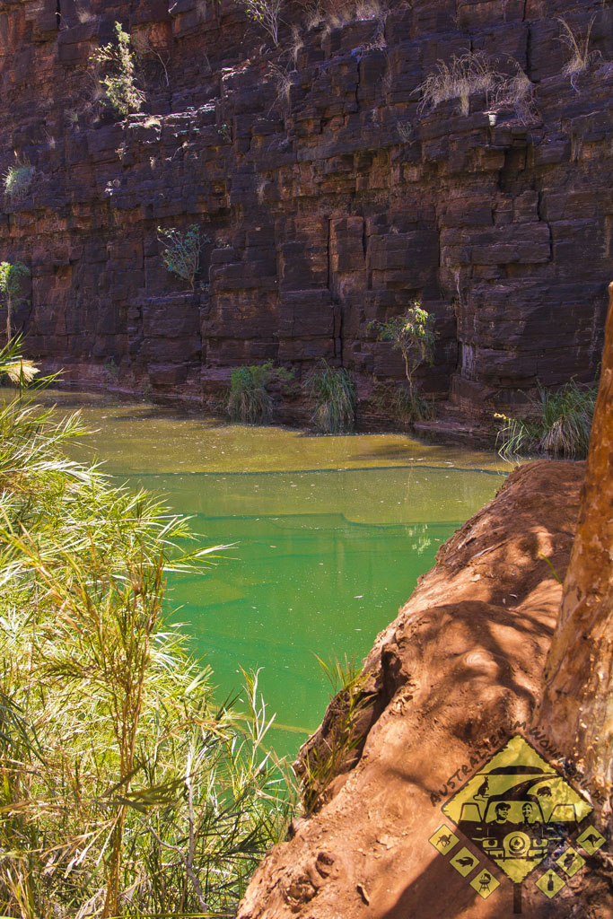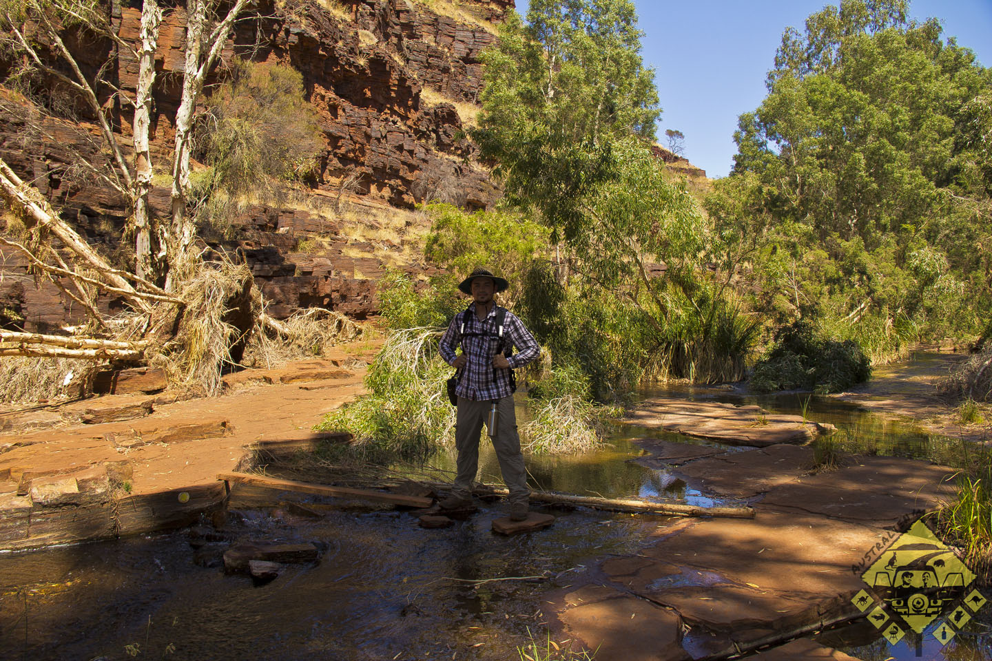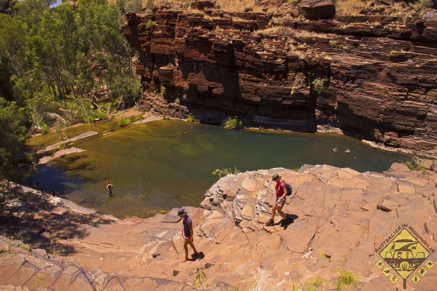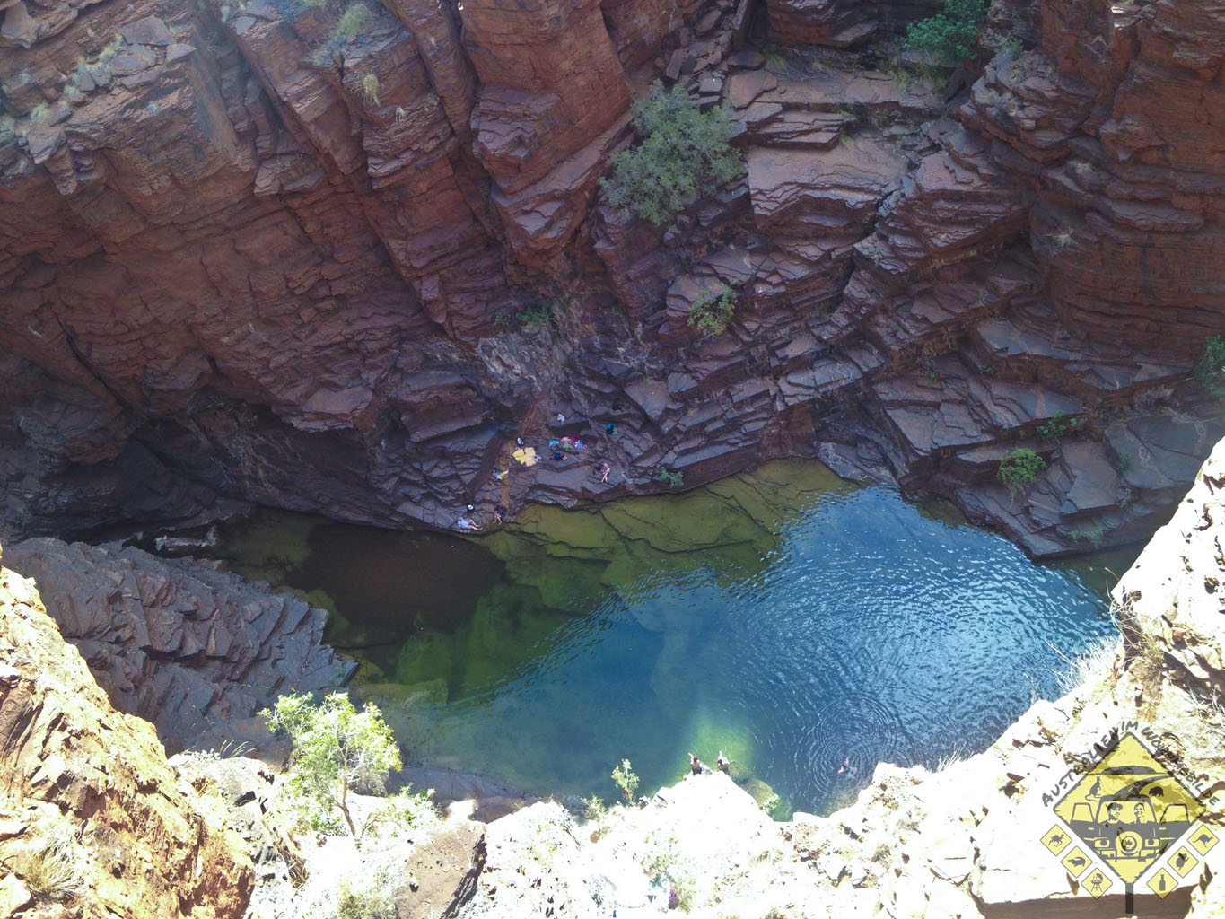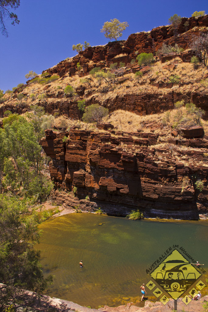 Wir haben da eher ein anderes Problem – wir unterschätzen uns oft. So unfit sind wir ja gar nicht (dank Crossfit und Fitnesstudio). Aber es passiert uns nicht selten, dass wir uns dann einen Walk aussuchen und treffen dann quitschfidele Wanderer die in Jeans und Stöckelschuhen ihre 120 auf 1 Meter Fuffzich verteilten Kilo über plane Wanderwege promenieren, während wir mit Karte und Wasserkanister in der Hand in unseren Wanderstiefeln daneben stehen.In Karijini ist uns das nicht passiert. Der Walk durch die DalesGorge war perfekt. Ein bißchen Klettern, ein bißchen schwitzen und großartige Aussichten und Fotomotive auf dem Boden der Schlucht.