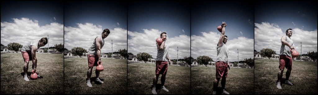 Ohne Schwung ziehe man die Kettlebell bis an’s Kinn. Wirkt gut auf den oberen Rücken und die oberen Schultermuskeln.