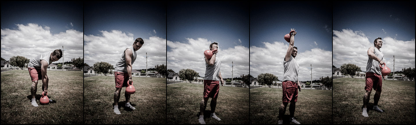 - Mit einer Drehung aus der Hüfte und gleichzeitigem Strecken der Beine wird die Kettlebell auf Schulterhöhe katapultiert – gleichzeitig dreht sich die Kettlebell oben über die Hand.